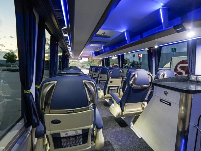 该车采用“2+1”布局的舒适座椅30个PremiumLine VIP座椅,满足长途出行的舒适需求,无平台地板设计消除了乘客舱内的遮挡障碍。此外,车辆配备带行人检测的EBA+紧急制动辅助系统、自适应巡航控制系统等多项辅助功能,兼顾安全与驾驶便利性。