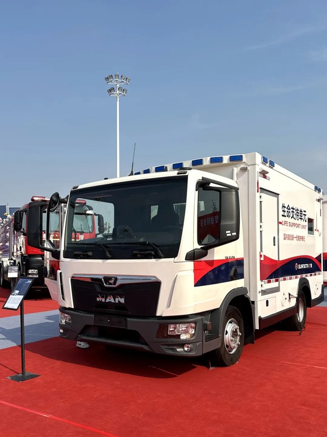 另一款明星展品——曼恩生命支持车,则基于TGL 12.250轻型底盘打造,该底盘作为曼恩城市应急领域的经典平台,采用4×2驱动形式,搭配小尺寸轮胎与紧凑驾驶室设计,大幅提升城市道路机动性;上装集成生命体征监测及移动供氧系统等急救设备,为救援人员提供持续后勤保障。
