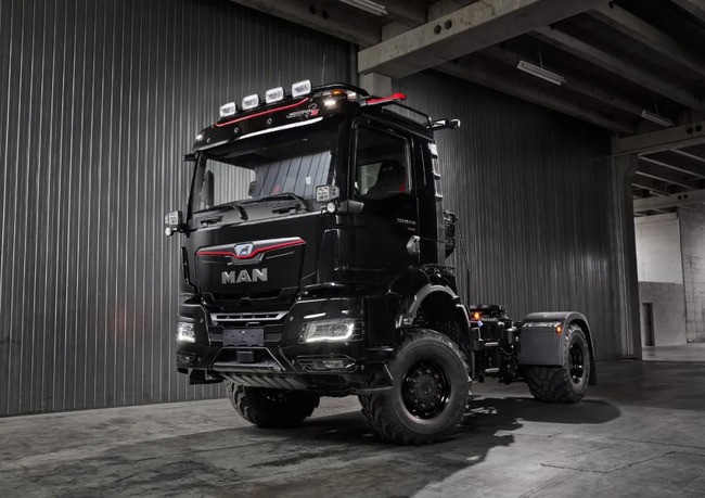 外观方面,该车搭载MAN TGS INDIVIDUAL LION S套件,将LED远光灯等功能配置与碳纤维及红色设计元素相融合,视觉效果极具冲击力。
