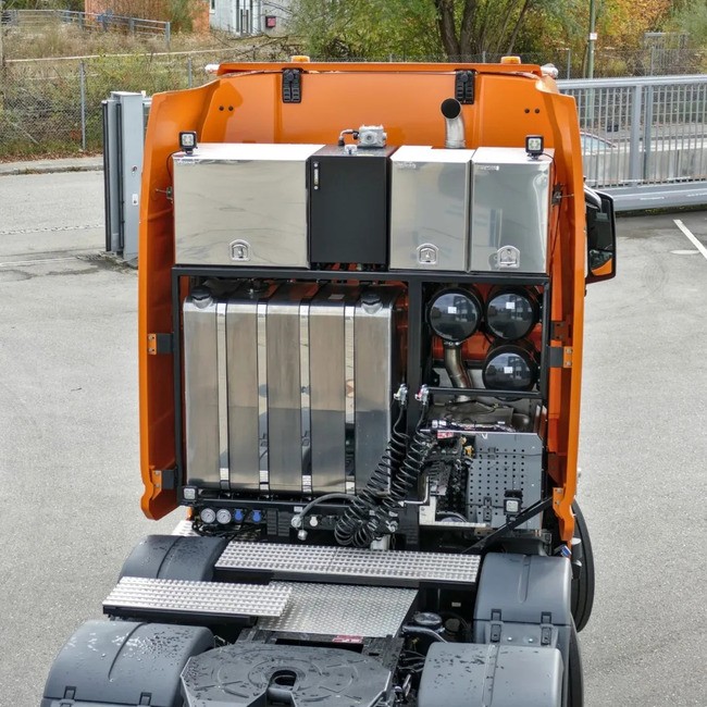 跟许多不带变矩器的四轴牵引车一样,这里都是增加车轴后移上来的底盘附件。875升的铝合金油箱、储气罐、尾气后处理系统等等,都一并移至这里。