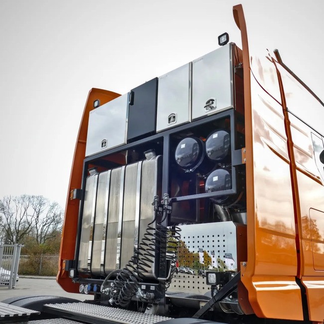 由于是重载运输,因此客户特意选择了工程保险杠的TGX,保险杠离地间隙更高,同时外观也相对更加粗犷。即便原车就标配了LED大灯,但欧洲车喜欢在车顶加装灯具的传统依然没有丢,四盏射灯与黄色的旋转警示灯一同安排上。