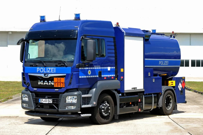 作为一台警用后勤车辆,那警示灯光自然得到位。这台曼恩TGS飞机加油车在车顶设计有两盏蓝色转灯,外部带有金属防护网,增强提示效果。上装部分设计有多盏黄色转灯,起到工作警示的效果。